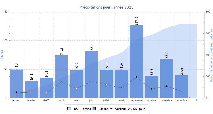 | fevrier | -4.0 °C | 2.5 °C | 15.3 °C | 8.3 °C | 5.1 °C | 10.6 km/h | 74.0 km/h | 150 |