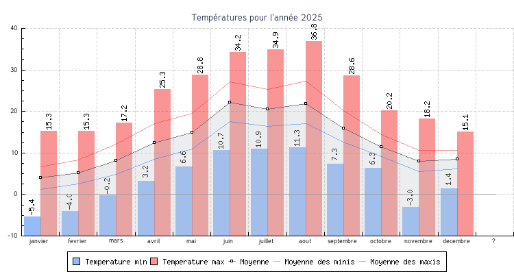 | juillet | 10.9 °C | 16.4 °C | 34.9 °C | 25.3 °C | 20.5 °C | 7.2 km/h | 45.1 km/h | 335 |